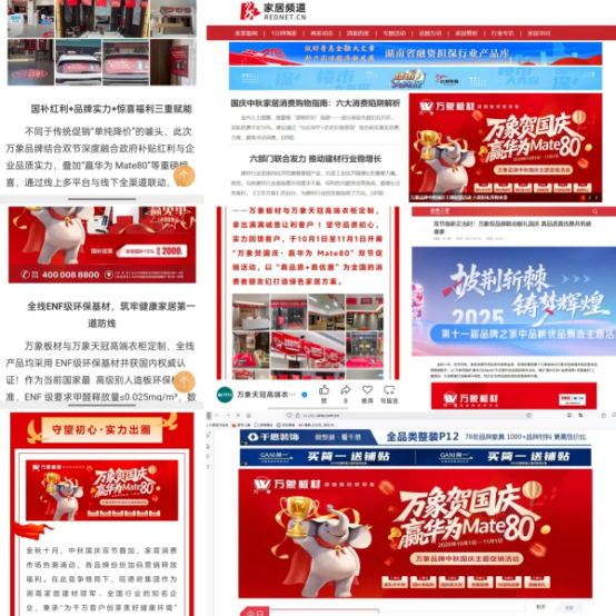 萬象品牌中秋國(guó)慶主題促銷活動(dòng)實(shí)現(xiàn)全域覆蓋式傳播。通過整合多元網(wǎng)絡(luò)渠道,聯(lián)動(dòng)紅網(wǎng)、新浪家居、行業(yè)權(quán)威媒體及公眾號(hào)等平臺(tái),精準(zhǔn)觸達(dá)高價(jià)值客群,真正達(dá)成“傳播無死角,觸達(dá)有精度”的目標(biāo)。