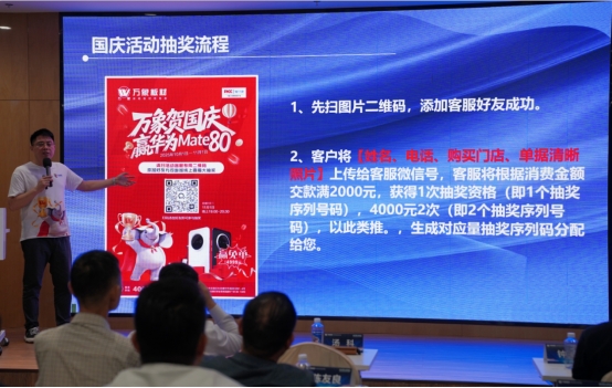 會上,湯科先生對“萬象賀國慶?贏華為 Mate80”線上抽獎活動的參與規(guī)則、時間節(jié)點等詳情政策進行了詳細宣講。同時,還針對本次會議專屬的多項重磅優(yōu)惠舉措展開解讀,為核心加盟商提供實實在在的合作支持。政策發(fā)布后,現(xiàn)場氛圍迅速升溫,咨詢與參與熱情顯著提升。最終,訂單數(shù)量遠超預期。