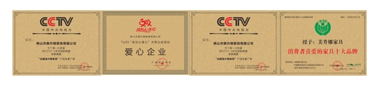 2012年,2013年先后獲得“中國家具行業(yè)十佳歐美家具品牌”、“十大創(chuàng)新品牌”、“消費者喜愛的十大品牌”、“央視網(wǎng)廣告合作品牌”等,。2017年美升娜家具與中央電視臺達成品牌戰(zhàn)略合作,在央視cctv-4頻道黃金時間段展播形象廣告,2018年簽約人氣明星“黃圣依”代言品牌形象,進一步提升美升娜品牌知名度,將美升娜的品牌走向全國,面向世界展示美升娜家具文化的魅力和內(nèi)涵。