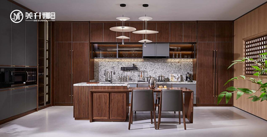 在家的所有空間中,廚房是最能體現(xiàn)生活溫度的地方。這里既有柴米油鹽的瑣碎,也有親友相聚的熱鬧;既有油煙的喧囂,也有木質(zhì)的沉靜。美升娜家具以北美黑胡桃木為材,在廚房空間里編織實(shí)用與美學(xué)的雙重奏,讓蒸騰的煙火氣與溫潤的木之韻在此共生共舞,將日常烹煮化作一場具象的生活藝術(shù)。