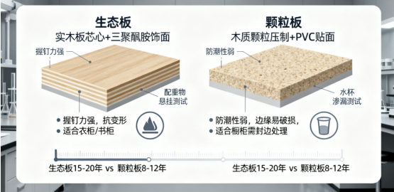 定制柜體選材:生態(tài)板對比顆粒板的耐用性與環(huán)保性深度解析