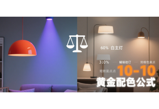 所謂60%黃金配色公式,就是在整體照明色彩搭配中,主色調(diào)占60%,輔助色調(diào)占30%,點綴色調(diào)占10%。這種比例的分配是基于人的視覺審美習(xí)慣和色彩心理學(xué)原理。主色調(diào)是整個空間照明的基礎(chǔ),它能夠營造出空間的整體氛圍;輔助色調(diào)起到補(bǔ)充和豐富主色調(diào)的作用,使空間更具層次感;點綴色調(diào)則是為了增添亮點和個性,讓空間更加生動有趣。
